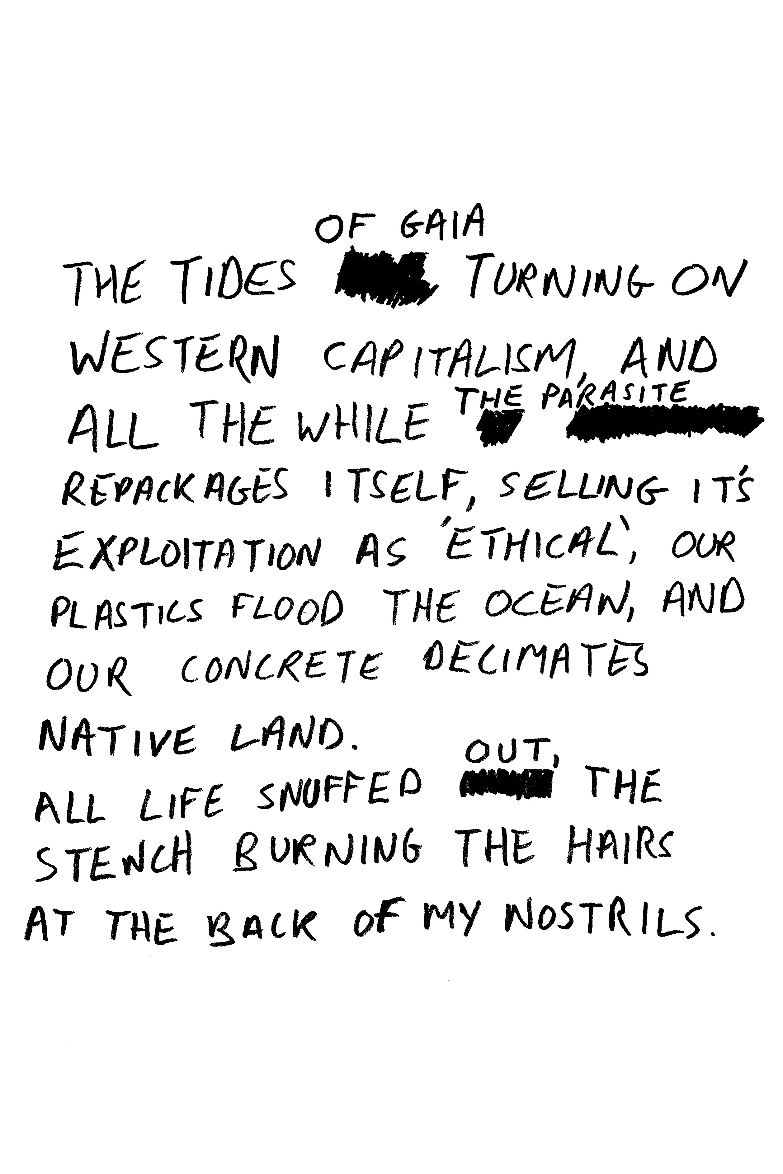 It’s been pretty clear for a while that the anthropocentric world is being destroyed by Capitalism, by the human, our society seems to amble on as though nothing is happening, walking blindly into a crisis. Though this is finally now frequently reported by news media, becoming the centre point of liberal white tv programmes, it seems that society for the most part doesn’t want to tackle the parallel growth spurts of climate change and Capitalist greed, deciding to focus on altering Capitalism, re-packaging it as ethical/green/environmentally friendly.