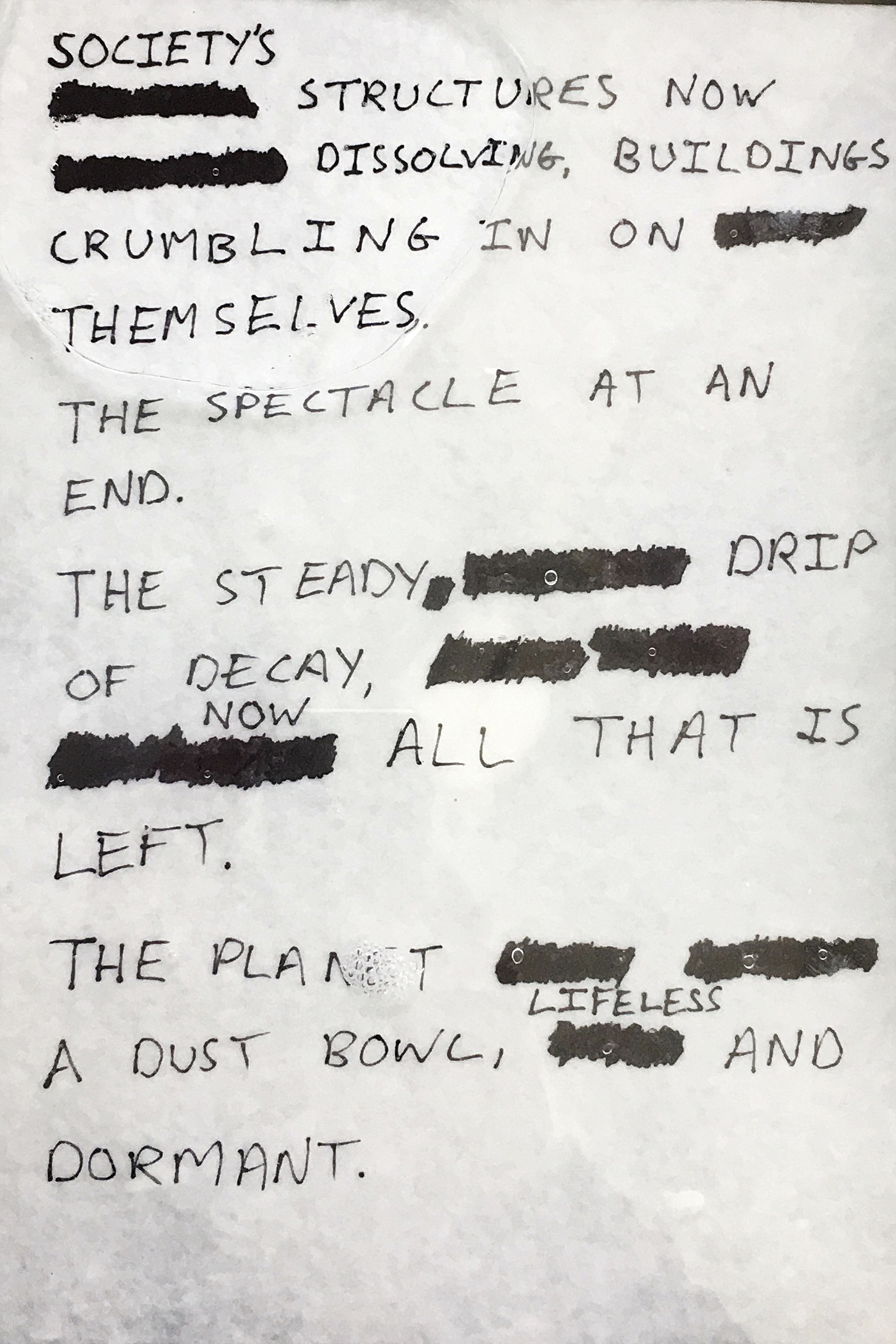 The TV and print news medias churn out the same neo liberal bile, this idea that we can simply barter with gaia, that the human world isn’t a speeding train heading towards the end of the tracks. The absurd reality is, and humanity seems totally unable to face it, the world is falling apart, accelerated by neo-liberal capitalism, but no immediate active change seems to be coming about, it’s all 10/20/50 year plans being promised.
