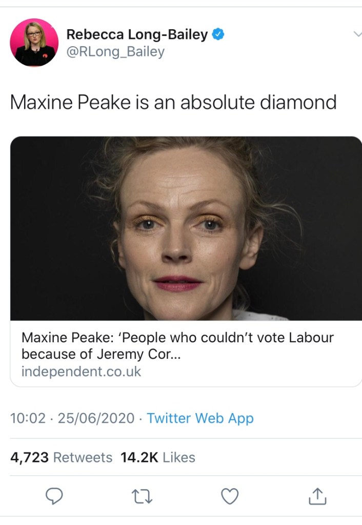Now to contextualise this for any none UK readers, Rebecca Long-Bailey was the opponent of Keir Starmer, the now Labour leader, and unsurprisingly gained a position in his shadow cabinet upon his election to party leader. To many socialists within the party Starmer has been seen as being cut from the same neoliberal cloth as Tony Blair, and represents a Labour Party shift away from the Corbyn era and back towards the centre ground, arguably in an attempt to be more “electable”, but yet another London-centric white man as leader probably isn’t the image that “the party of the working class” should be pushing, but that’s just one man’s opinion, and this piece isn’t meant to be about Starmer or his politics. On Thursday 25 of June Rebecca Long-Bailey shared an interview from the independent with national treasure, and staunch Labour Party member Maxine Peak along with the caption Maxine Peak is an Absolute Diamond, the article itself discusses her most recent film, politics, race, and art, subjects that Peak has broached on many occasions however the controversial element was that Peak voiced claims that ‘The tactics used by the police in America, kneeling on George Floyd’s neck, that was learnt from seminars with Israeli secret services.’ It’s said in the article that a spokesperson for the Israeli secret services negates this theory, and it’s difficult to pin down whether this is a truthful statement, or a dangerous conspiracy theory.